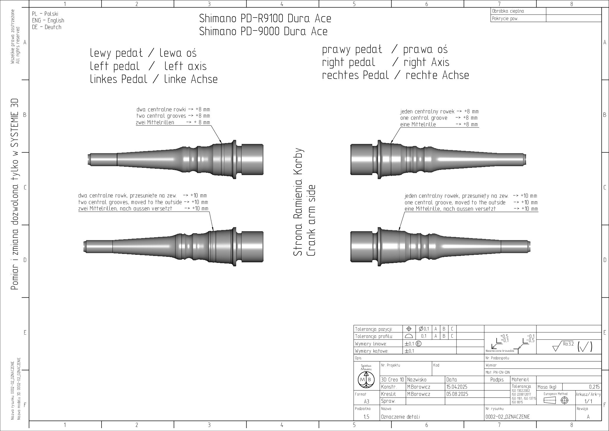 Oś lewa do pedału Shimano PD-R9100 – Dura Ace + 8mm – o zwiększonej odległości Q-Factor – 60 mm
